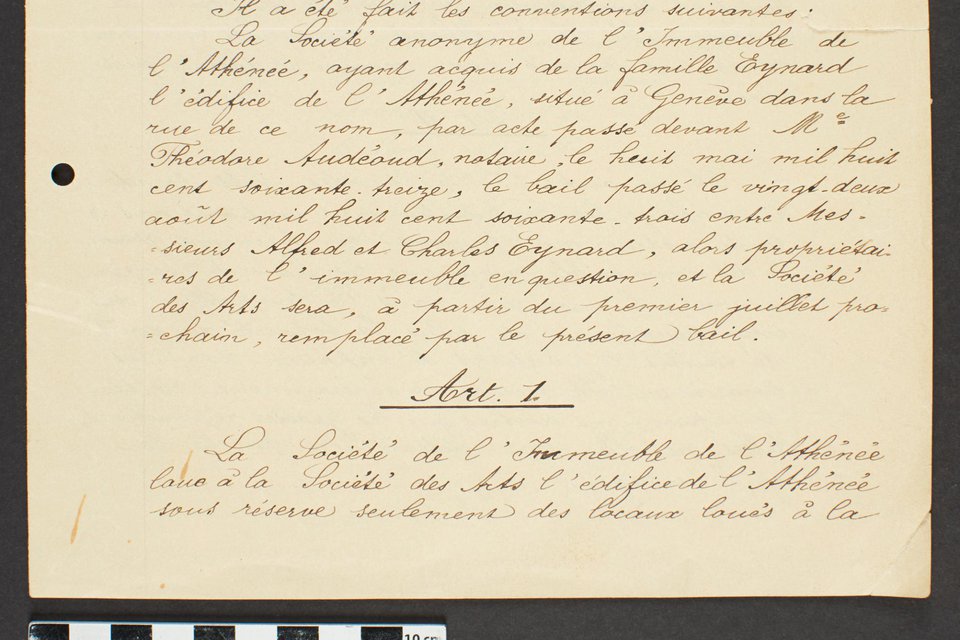 Bail à loyer entre la Société anonyme de l'Immeuble de l'Athénée et la Société des Arts pour la location du Palais de l'Athénée